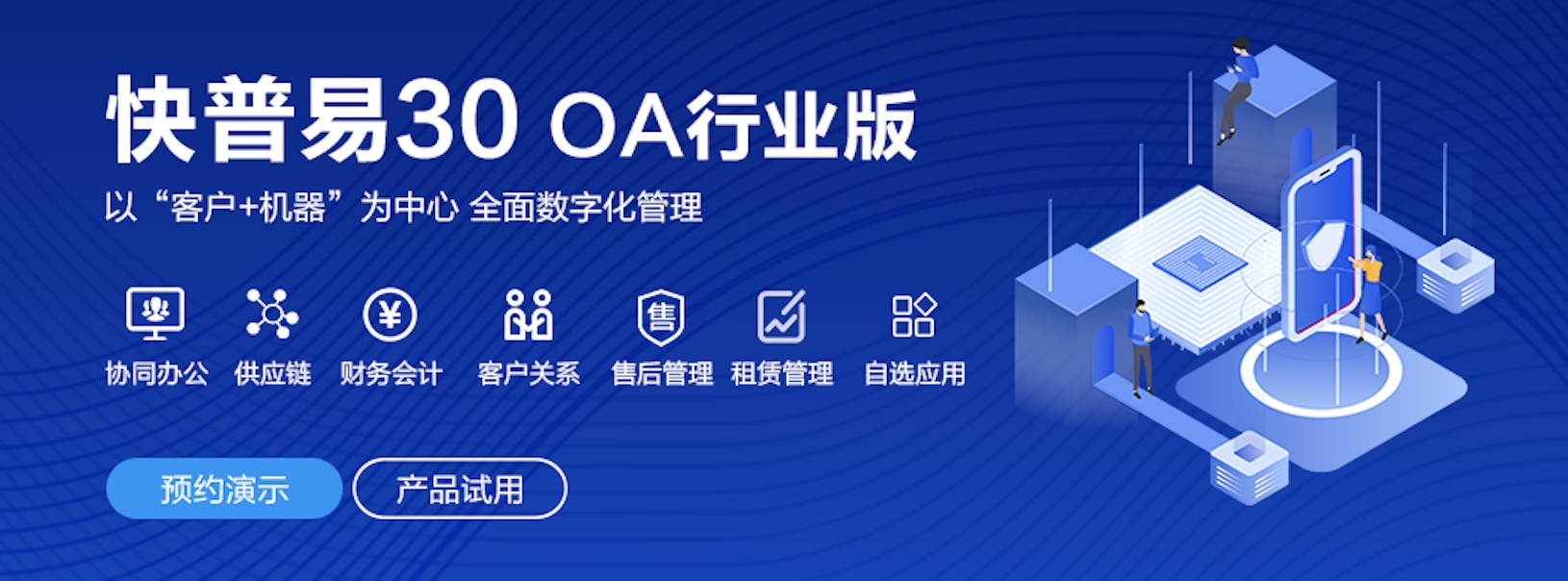 快普易30基于快普近20年在全國(guó)上萬(wàn)家OA企業(yè)的實(shí)施與服務(wù)經(jīng)驗(yàn),融合了行業(yè)成功的管理智慧,以“客戶(hù)+機(jī)器”為中心提供數(shù)字化轉(zhuǎn)型解決方案,全面解決銷(xiāo)售、服務(wù)、租賃等多種業(yè)務(wù)模式的管理需求,以及企業(yè)經(jīng)營(yíng)核算分析。
