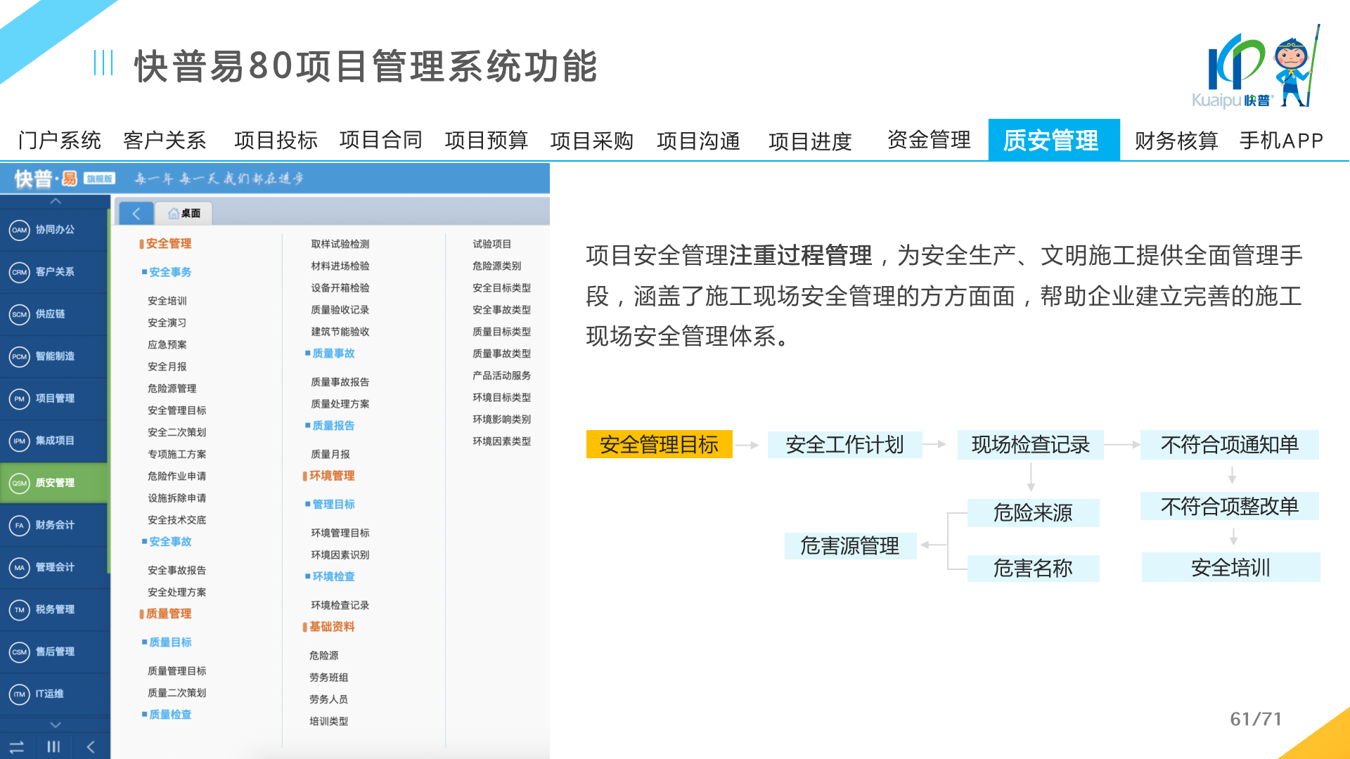 快普易80以項目管理為核心,通過“四控、四管、一協(xié)調(diào)”方式,對項目進(jìn)度、成本、資金、質(zhì)量安全進(jìn)行全面控制,實現(xiàn)投標(biāo)管理、合同管理、物資管理、預(yù)算管理等項目全生命周期項目的數(shù)字化管理,實現(xiàn)資源合理配置、保障良好的項目效益。