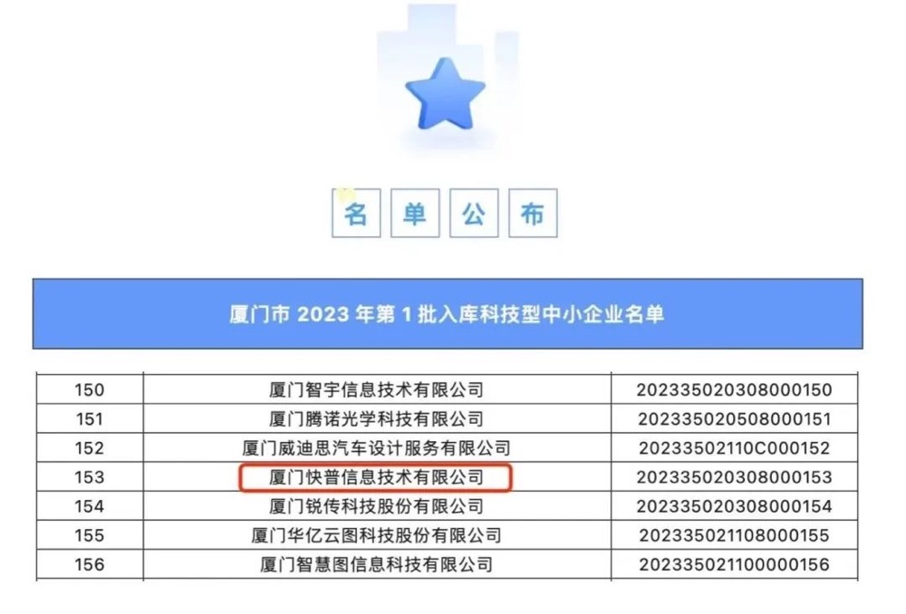 繼“廈門市創(chuàng)新型中小企業(yè)”認定后,快普再傳捷報!近日,廈門市科技局發(fā)布了《2023年第一批入庫科技型中小企業(yè)名單》,快普赫然在列。該項評定意味著快普的技術成果、科技含量、創(chuàng)新能力等方面獲得了政府相關部門的充分肯定,同時也表明快普在科技創(chuàng)新、技術研發(fā)和知識產權保護方面邁上了一個新的臺階。