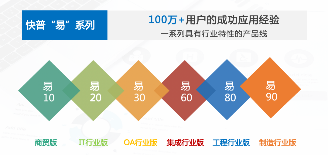 除易10之外,快普“易”系列同時推出了多個行業(yè)版本(如下圖),用“標(biāo)準(zhǔn)化+行業(yè)化+個性化”等特性解決企業(yè)大量個性化需求,從而幫助客戶高效率、低成本地實現(xiàn)數(shù)字化轉(zhuǎn)型升級。