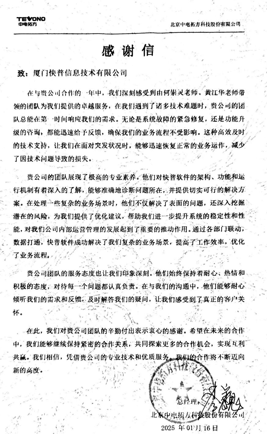 【快普簡訊】 北京中電拓方科技股份有限公司向我司發(fā)來感謝信,對何崇靈老師、黃江華老師帶領(lǐng)的實施小組在過去一年中提供的優(yōu)質(zhì)服務(wù)表示高度認可和衷心感謝。來信不僅是對快普實施團隊專業(yè)能力的肯定,更是對快普“客戶至上”服務(wù)理念的詮釋。